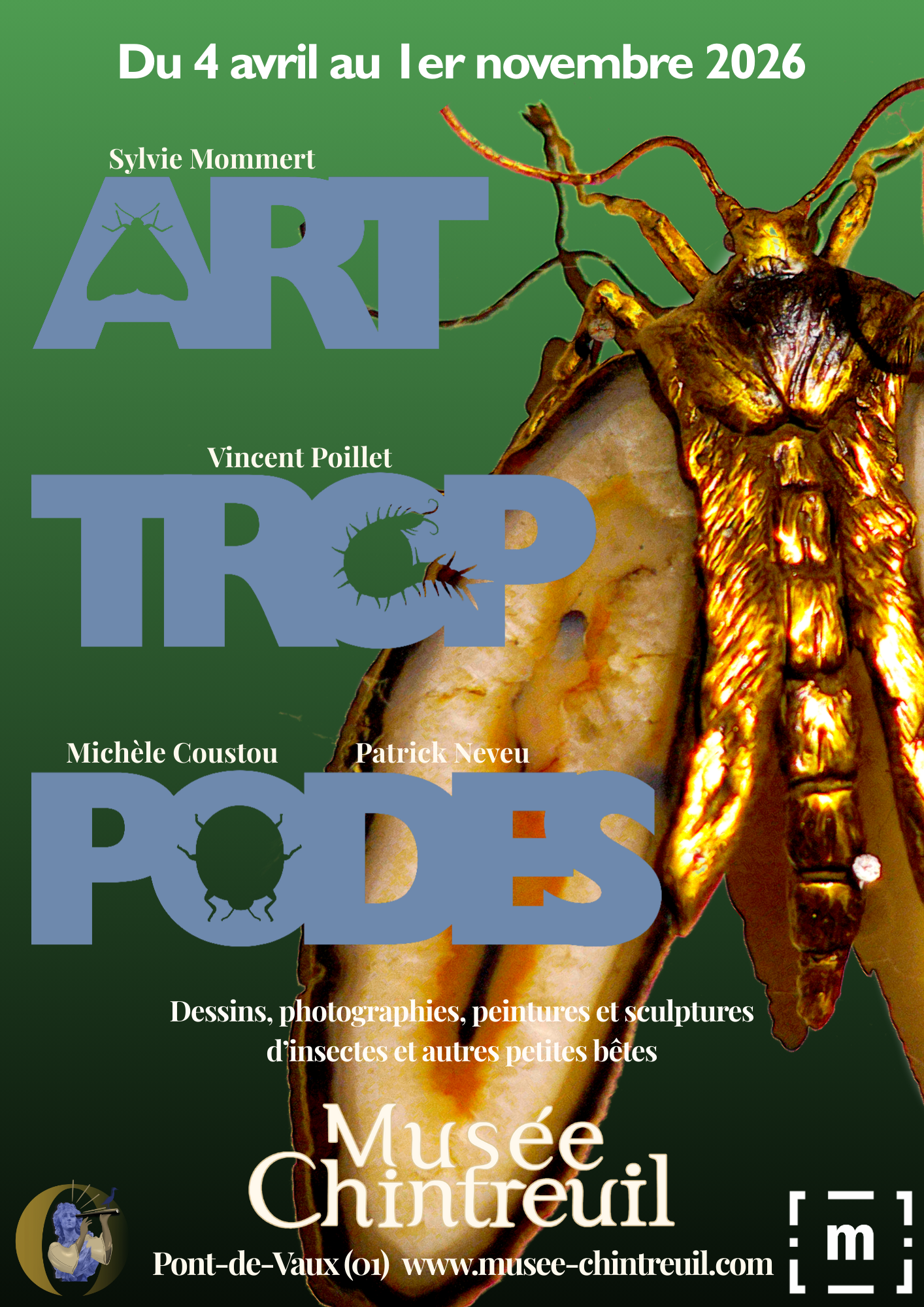 Cette exposition associe quatre fervents défenseurs de la beauté des arthropodes, en particulier des insectes, que nous trouvons sur notre territoire : Sylvie Mommert, Michelle Coustou, Patrick Neveu et Vincent Poillet. La démarche choisie est plus esthétique que pédagogique. Chacun à leur façon, ils nous permettent de découvrir à quel point la nature qui nous environne recèle de beauté. Capter et transcrire cette splendeur invisible par le dessin, la peinture, la photographie ou l’orfèvrerie, c’est offrir la possibilité de faire évoluer notre regard sur ce monde fascinant, « utile » à l’homme et fragile.